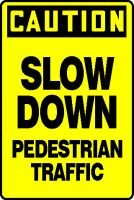 CAUTION SLOW DOWN PEDESTRIAN TRAFFIC Sign - 18" x 12" .040 Aluminum. ALUMINUM (VA). Aluminum provides the strength of metal, yet does not rust. It has superior abrasion and chemical resistance.Material Features: Vinyl sign is permanently bonded to a rigid .040" aluminum backing. Protected by 2-mil high-gloss UV polyester over-laminate film. Service temperature range: -20F to 140F. Withstands splashes and washdowns. Endures outdoor environmental conditions. Rounded corners and 3/16" mounting holes. 5 Year Manufacturer Guarantee. Safety Signs